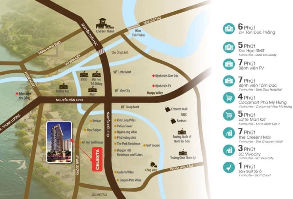 • Cách KĐT Phú Mỹ Hưng 5,5km; cách KĐT Hiệp Phước 7km; cách BV Pháp Việt 7,5km.