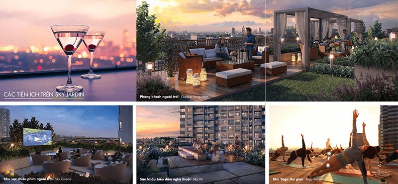 Mỗi sáng thức dậy, bạn có thể thư thái lặng mình ngồi thiền tĩnh tại Zen Garden hay Yoga Retreat để tận hưởng tinh hoa của đất trời; đêm về hòa mình thưởng thức sự náo nhiệt, sôi động với những bản nhạc thời đại tại Sky Arts – sân khấu biểu diễn nghệ thuật thú vị; xem một bộ phim yêu thích tại rạp chiếu phim “ngàn sao” Sky Cinema hay BBQ ngoài trời cùng bạn bè và người thân. Tại Sky Jardin, nhịp sống sôi động và tràn đầy năng lượng đang chờ đón bạn.
